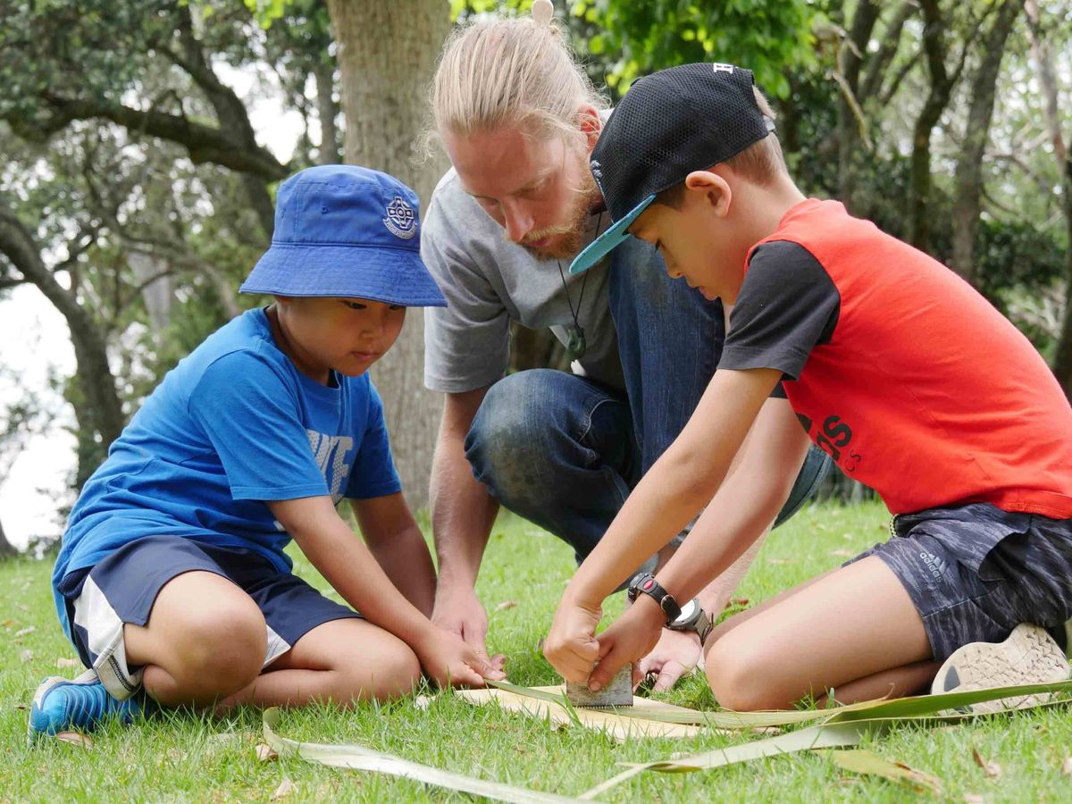 Hearing the Legend of Maui, and how he used flax ropes to ensnare the sun, the boys learnt how to strip and prepare flax for plaiting. The boys took the responsibility of handling ‘stripping knives’ – a section of saw tooth – very sensibly, working in pairs to soften the fibres before plaiting and adding beads to create bracelets.