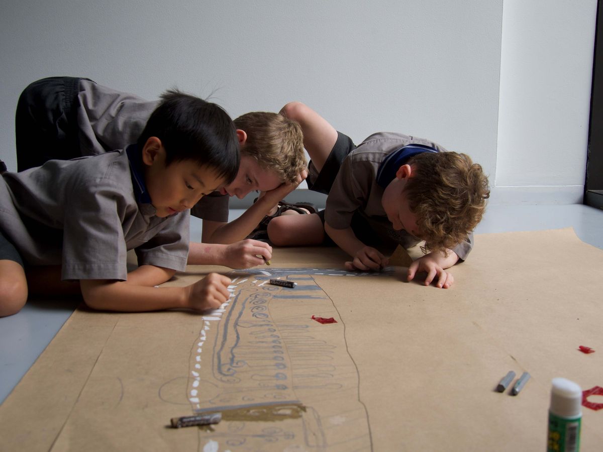 After hearing the incredible story of Sophia, the boys were split into five groups, each with a significant part of the story to depict, before collectively creating a mural. Some had to draw the ghost waka, others the wooden waka, while several other groups were given the volcano, Pink and White Terraces, and Sophia’s house. Together with the help of some oil pastels and construction paper, each class created a mural of the story.