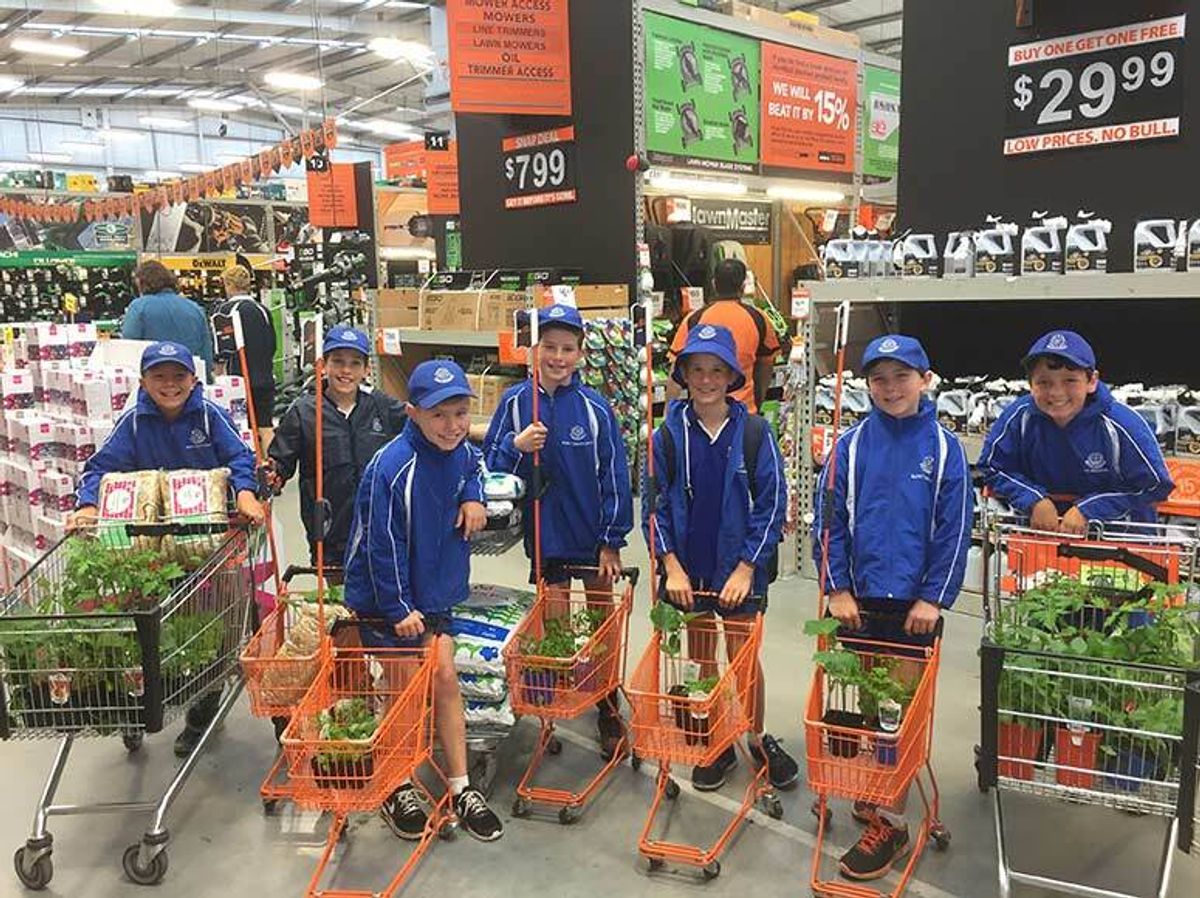 After morning tea, the team all headed to Mitre10 to pick up plant and irrigation supplies. Each boy was responsible for finding several items on the list. We wanted the vegetable garden to have a variety of nutritious plants, so we selected strawberries, spinach, lettuce, cucumber, parsley, mint, carrots, tomatoes, courgettes, radishes, celery and beans, as well as some marigolds and snail pellets to keep the bugs away. The gardens also needed fresh soil and equipment to extend and repair the irrigation system as we didn’t want the plants to dry out and die after all our hard work.